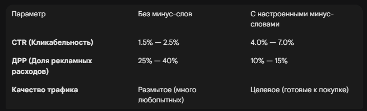 Пример из практики: Селлер спортивных ковриков тратил 5000 руб. в день, показываясь по запросу «йога» и «фитнес». После минусации этих широких слов и концентрации на узком кластере «коврик для йоги нескользящий 6мм», расход упал до 2000 руб., а количество заказов выросло на 20%. ДРР снизился в 3 раза.