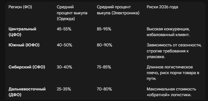 В 2026 году сформировалась четкая зависимость процента выкупа от удаленности склада и специфики менталитета регионов: