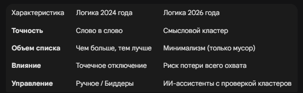 И помните: В 2026 году минус-слово — это хирургический инструмент. Одно неловкое движение — и ваша карточка в "коме". Работайте с семантикой осторожно, опираясь на данные о кластерах, а не на интуицию.