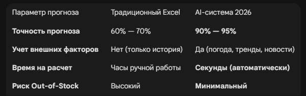 - Учет "Нелинейных связей": ИИ понимает, что спрос на солнцезащитные очки коррелирует не только с датой, но и с индексом ультрафиолета и ценой на авиабилеты в теплые страны. Excel такие связи не видит.