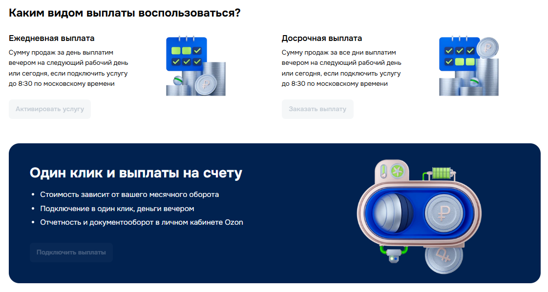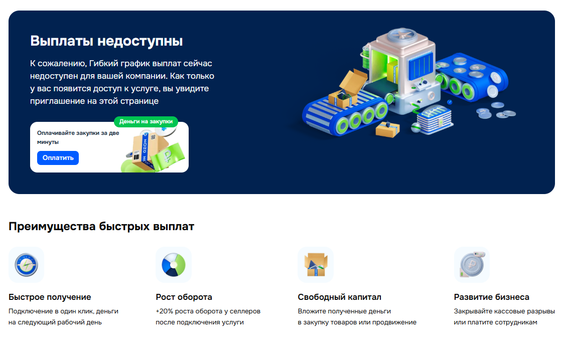 - Условия подключения: Услуга доступна селлерам, которые торгуют на площадке более 3 месяцев, не имеют задолженностей и подходят под внутренние критерии стабильности Озона.