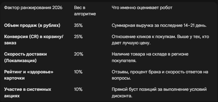 В 2026 году Wildberries официально подтвердил, что выдача формируется на основе динамических весов. Если раньше «объем продаж за 14 дней» забирал 70% веса, то сейчас структура выглядит иначе: