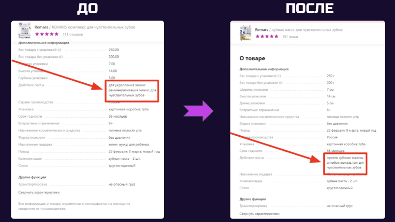 ПОСЛЕ появилось больше данных о восстановлении, естественной защите эмали, об органической косметике для зубов и ее натуральном составе. Обратите внимание: это не просто слова через запятую, а полноценные предложения с фразами, которые вбивают люди в поисковой строке на Wildberries. Да, над описанием пришлось поработать чуть больше. Здесь не два, тут добавили 35 слов примерно. Описание стало в 2 раза больше за счет необходимой информации; если раньше в нем везде была отсылка на Remars, то сейчас это наименование встречается лишь один раз.