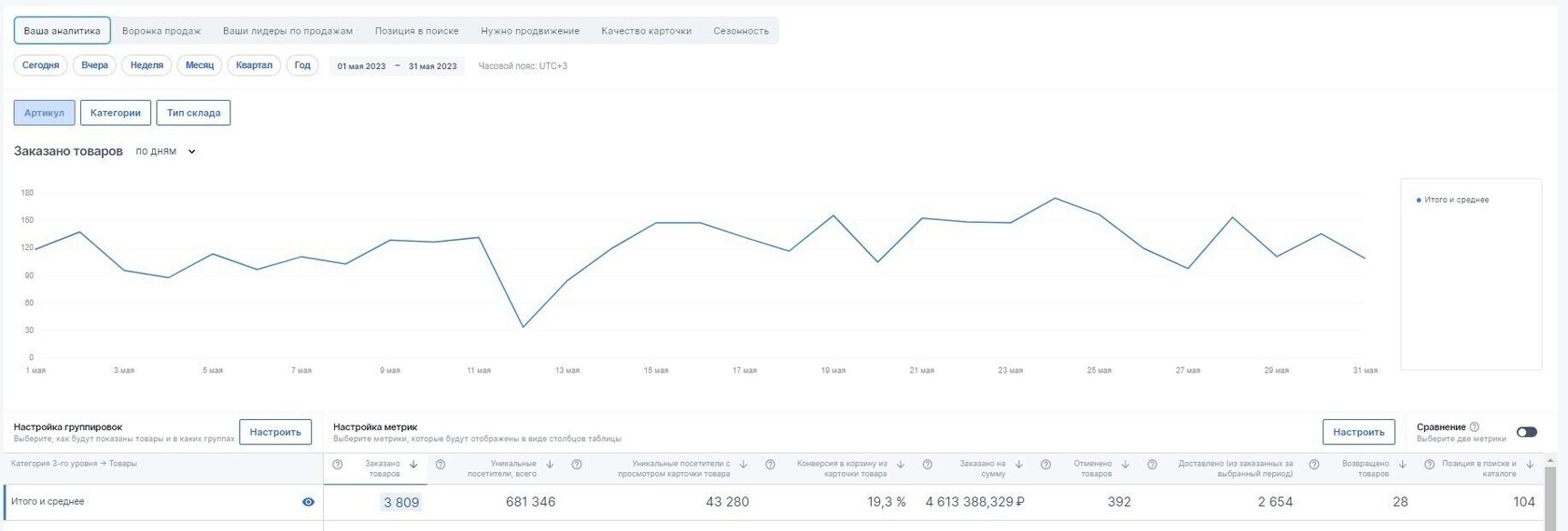 Сотрудничество с брендом Х продолжается. Сейчас фронт работ примерно такой же: настраиваем внутреннюю рекламу, организуем участие в акциях, продолжаем делать SEO-оптимизацию карточек. Вот результаты за мая 2023 года: